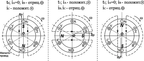 Рис.3.29. Схемы, поясняющие вращение магнитного поля трёхфазной системы