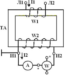 Рис.4.11. Схема включения измерительных приборов в однофазную сеть через трансформаторы тока и напряжения