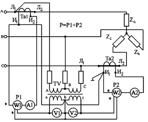 Рис.4.12. Схема включения измерительных приборов в трёхфазную сеть через трансформаторы тока и напряжения