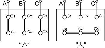 Рис.6.2. Схемы подключений зажимов фаз статорных обмоток асинхронного двигателя, соединёных треугольником и звездой