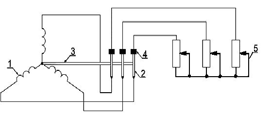 Фазная обмотка ротора (рис.6.3) выполнена в виде трёхфазной обмотки 1, соединённой звездой. Начала этих обмоток подключены к трём медным изолированным кольцам 2, укреплённым на валу 3 ротора. Поверхности колец скользят по неподвижным щёткам 4. Щётки соединены с трёхфазным пусковым реостатом 5, предназначенным для уменьшения пускового тока и увеличения вращающего момента двигателя.