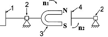 При вращении рукоятки 1 через ось 2 будет вращаться постоянный магнит 3, образуя вращающее магнитное поле, которое приводит во вращение медный диск 4 в направлении вращения магнитного поля. Частота вращения магнита будет превышать частоту вращения диска