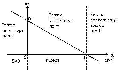 . В зависимости отскольжения возможны следующие режимы работы электрической машины: режим генератора, режим электродвигателя и режим электромагнитного тормоза (рис.6.6).
