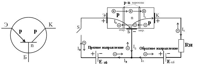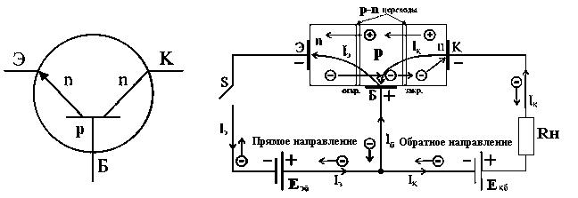 Конструктивно транзистор имеет три электрода эмиттер Э, база Б, коллектор К. Области n -типа и p -типа разделены запирающими p-n переходами. Под действием внешних электрических полей Eэб и Eкб левый p-n переход, при включенном ключе S, открыт, правый p-n переход закрыт, так как электроды эмиттер и база подключены к источнику Eэб в прямом (проводящем) направлении, а электроды коллектор и база подключены к источнику Eкб в обратном (не проводящем) направлении.