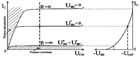 Рис.7.22. Совмещение выходных характеристик полевого транзистора с управляющим p-n- переходом Iс = f(Uси) при Uзи = Const с входной характеристикой транзистора Iс = f(Uзи) при Uси = Const.