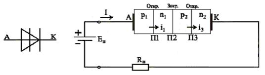 Если между анодом (А) и катодом (К) приложить небольшое постоянное напряжение, в прямом направлении, то при этом p-n -переходы П1 и П3 будут открытыми и их сопротивления малы. Переход П2 будет закрыт, так как он включен в обратном направлении и его сопротивление велико. Вентиль будет закрыт.