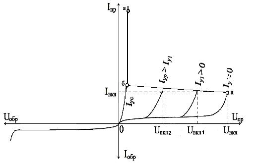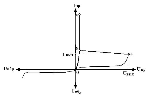 На рис.7.24 изображена вольтамперная характеристика динистора, которая подобна ветви обратной характеристики диода. При увеличении прямого напряжения питания до напряжения включения
