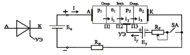Тиристор имеет три электрода анод (А), катод (К) и управляющий электрод (УЭ), который соединён со средней областью