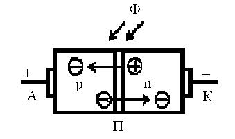 При отсутствии светового потока Ф р-n -переход П заперт. При освещении запирающего р-n -перехода происходит фотогенерация, фотоны света образуют пары электрон-дырка свободных зарядов, при этом свободные электроны переходят в слой n, свободные дырки - в слой p.
