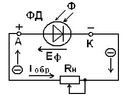 В режиме преобразователяв цепь фотодиода последовательно с нагрузкой включается источник ЭДС в запирающем (обратном) направлении. На рис.7.36 изображён преобразовательный режим работы фотодиода.