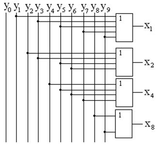 Используя полученные логические операции, можно реализовать логическую схему шифратора, построенную на логических элементах ИЛИ, приведённую на рис.9.10. Шифраторы используются в устройствах ввода информации в цифровые системы с клавиатуры.