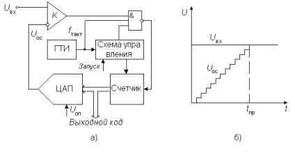 Работа преобразователя начинается с прихода импульса запуска, который включает счетчик, суммирующий число импульсов, поступающих от генератора тактовых импульсов ГТИ. Выходной код счетчика подается на ЦАП, осуществляющий его преобразование в напряжение обратной связи U ос. Процесс преобразования продолжается до тех пор, пока напряжение обратной связи сравняется со входным напряжением и переключится компаратор, который своим выходным сигналом прекратит поступление тактовых импульсов на счетчик. Переход выхода компаратора из 1 в 0 означает завершение процесса преобразования. Выходной код, пропорциональный входному напряжению в момент окончания преобразования, считывается с выхода счетчика.