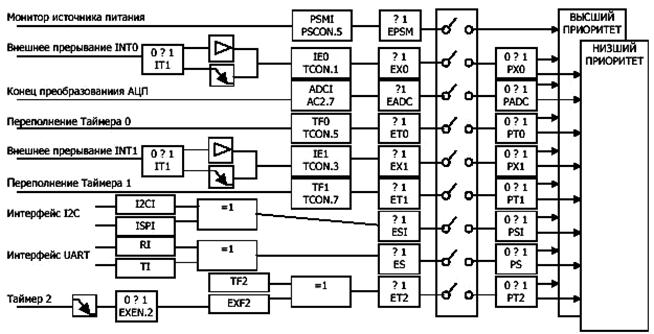 В микроконверторе поддерживается 9 прерываний с двумя уровнями приоритета.