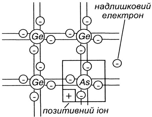 Для получения полупроводников с электронной проводимостью n -типа в чистый по составу исходный материал вводят примесь, создающую избыточные свободные электроны (рис. 1.2). В качестве такой добавки используют элементы V группы таблицы Менделеева – сурьма, фосфор, мышьяк. При застывании в некоторых узлах кристаллической решетки германия его атомы замещаются атомами примеси. При этом четыре валентных электрона примеси создают систему ковалентных связей с четырьмя валентными электронами германия, а пятый электрон примеси оказывается лишним – свободным. Свободные электроны оставляют в узлах кристаллической решетки неподвижные положительно заряженные ионы, которые создают в кристалле объемный заряд. Примесь, отдающая свободные электроны, называется донорной.