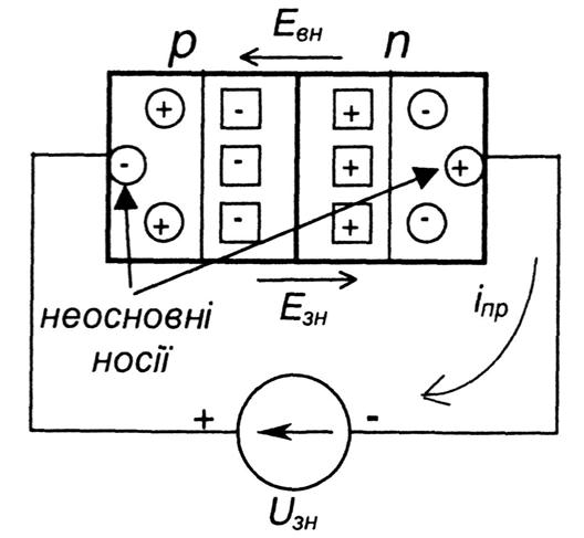 При прямом включении (рис 2.3) к p-n переходу прикладывается внешнее напряжение Uвн, причем отрицательный потенциал к слою с n проводимостью, а положительный потенциал к слою с p проводимостью.