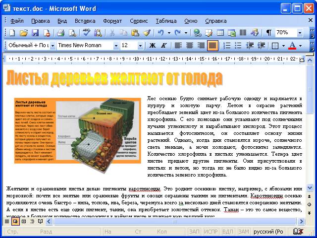 Наиболее часто используемый режим просмотра документа - Разметка страницы. В этом режиме положение текста, таблиц, рисунков и других элементов отображается так, как они будут размещаться на печатной странице (рис. 1.2). Режим разметки удобно использовать и при создании документа, и для окончательного оформления документа, в том числе, для изменения колонтитулов и полей, а также работы с колонками текста и графическими объектами.