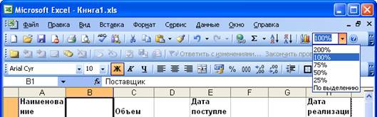 Для изменения масштаба отображения листа используют раскрывающийся список Масштаб панели инструментов Стандартная (рис. 2.5). В списке можно выбрать любое из имеющихся значений масштаба. При желании можно установить удобный масштаб самостоятельно. Для этого необходимо в поле раскрывающегося списка ввести с клавиатуры любое значение от 10 % до 400 % (символ процента вводить необязательно) и нажать клавишу клавиатуры Enter.