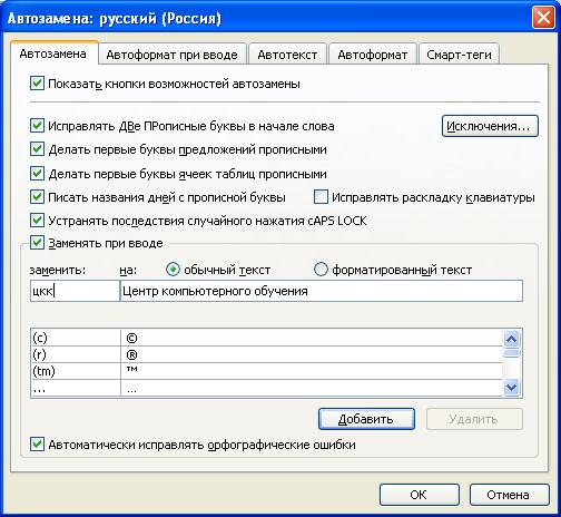 Средство "Автозамена" используется для автоматического обнаружения и исправления опечаток, орфографических ошибок и неправильного использования прописных и строчных букв. Но это же средство можно использовать и для ускорения ввода часто используемых слов и выражений.