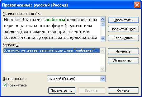 Рис. 6.9. Проверка правописания - грамматика (диалоговое окно "Правописание")