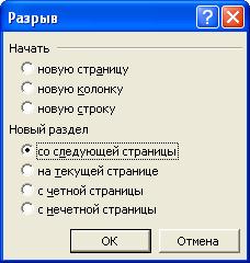 Для вставки разрывов выполните команду Вставка/Разрыв и в диалоговом окне Разрыв (рис. 13.10) выберите требуемый тип разрыва.