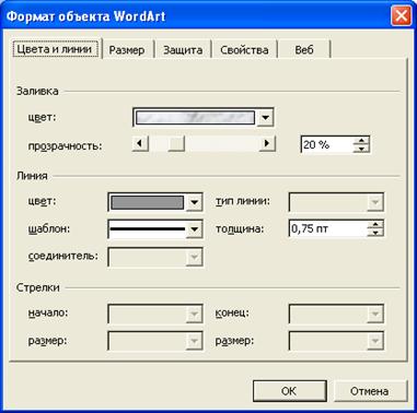 Можно изменить прозрачность цвета заливки. Для этого надо выделить фигурный текст и выполнить команду Формат/Объект WordArt или нажать кнопку Формат объекта панели WordArt. Во вкладке Цвета и линии диалогового окна Формат объекта WordArt (рис. 24.18) величину прозрачности можно установить соответствующим регулятором или в счетчике.