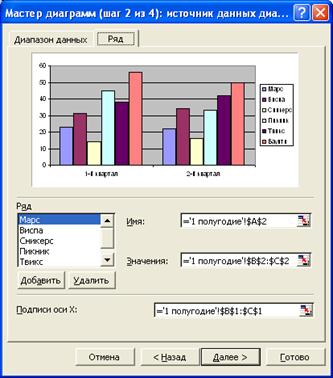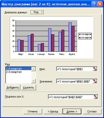 В диалоговом окне Мастер диаграмм (шаг 2 из 4): источник данных диаграммы можно уточнить или заново выбрать источник данных для диаграммы. Диалоговое окно имеет две вкладки: Диапазон данных и Ряд.