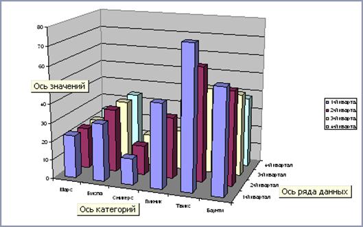 Одна из осей является осью значений. По ней отсчитывают значения рядов данных диаграммы. Как правило, это вертикальная ось, ось У (рис. 28.11), а на объемных диаграммах - ось Z (рис. 28.12).