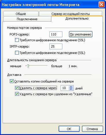 Во вкладке Дополнительно (рис. 29.7) можно установить параметры доставки сообщений. Например, для того чтобы поступившие сообщения не сразу удалялись с сервера входящей почты, можно установить флажок Оставлять копии сообщений на сервере.