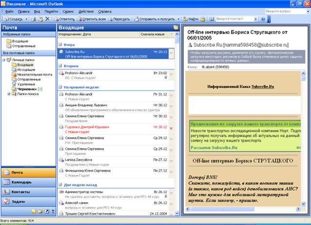Рис. 30.3. Окно области "Почта" Microsoft Outlook