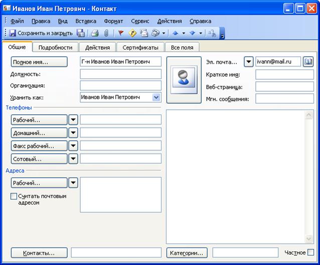 Информацию можно вводить во все вкладки окна Контакт. По окончании ввода информации нажмите кнопку Сохранить и закрыть (рис. 32.6).