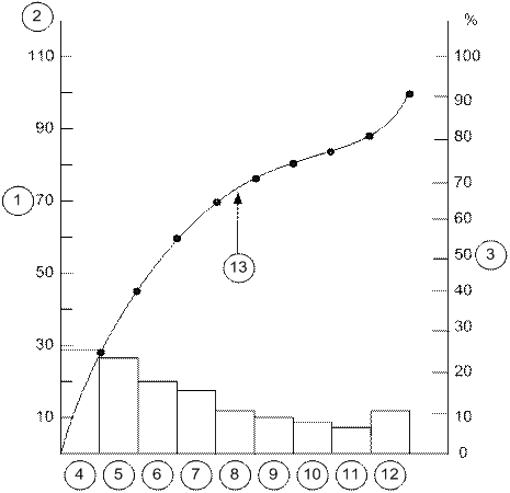 Сумма потерь (за месяц); 2 — тыс. рубл.; 3 — соотношение отрезков кривой кумулятивной суммы;