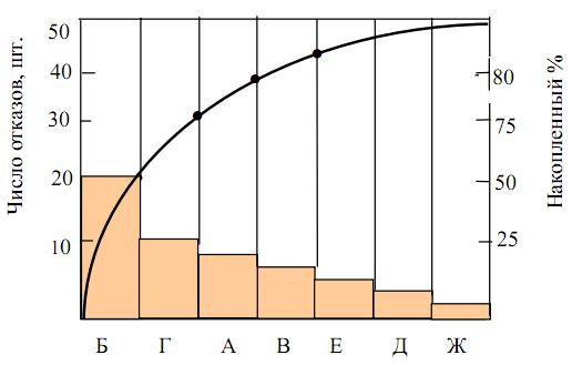 Легко подсчитать, что средняя наработка на отказ составляет 40 часов. Очевидно, что для повышения вероятности безотказной работы объекта всё равно, какие из причин отказов будут ликвидированы в первую очередь, так как наработка на отказ зависит от числа отказов, а не их вида. Проведём необходимые расчёты по накопленному числу отказов в рамках анализа Парето и нарисуем диаграмму Парето (рис. 4.9). Применяя правило Парето, что 80% всех дефектов вызываются 20% всех причин, получим из диаграммы, что 80% всех дефектов составляют только три вида отказов (Б, Г, А). Поэтому, следуя классическому анализу Парето, необходимо в первую очередь искоренять причины именно этих видов дефектов.