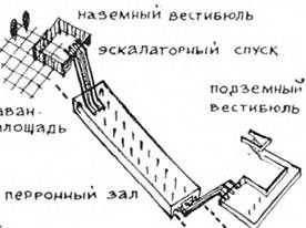 Рис. 14.7. Средовые объекты и система метрополитена: а – «элементарный фрагмент среды в виде перонного зала метро; б – комплексный средовый объект в виде станции метро; в – крупная средовая система – кольцевая линия