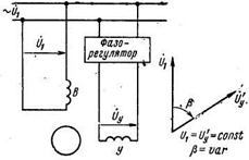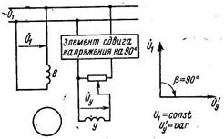 Фазовое управление (рис. 2.10). Обмотку возбуждения В подключают к сети переменного тока с номинальным напряжением U1. Ha обмотку управления У подают номинальное напряжение, переменное по фазе относительно напряжения возбуждения. Номинальным называют такое напряжение управления, которое соответствует равенству UУ' = U1. Управление угловой скоростью ротора осуществляют изменением фазы напряжения управления (угла β). За коэффициент сигнала принимают sin β. При sin β = 1 вращающееся магнитное поле статора круговое; при l > sin β > 0 – эллиптическое, при sin β = 0 – пульсирующее.