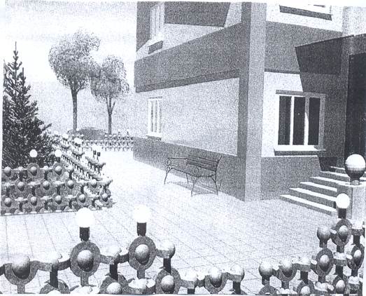 Рис. 14.12. Проект пространственной среды, включающей жилой дом, художественную ограду из бетона и деревья [3]