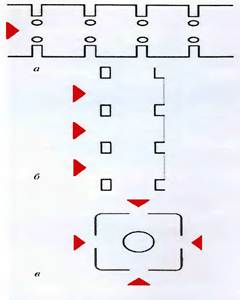 Рис. 15.17. Типология пространств: а – пространство, развивающееся в глубину; б – пространство, развивающееся фронтально; в – концентрическое пространство [1]