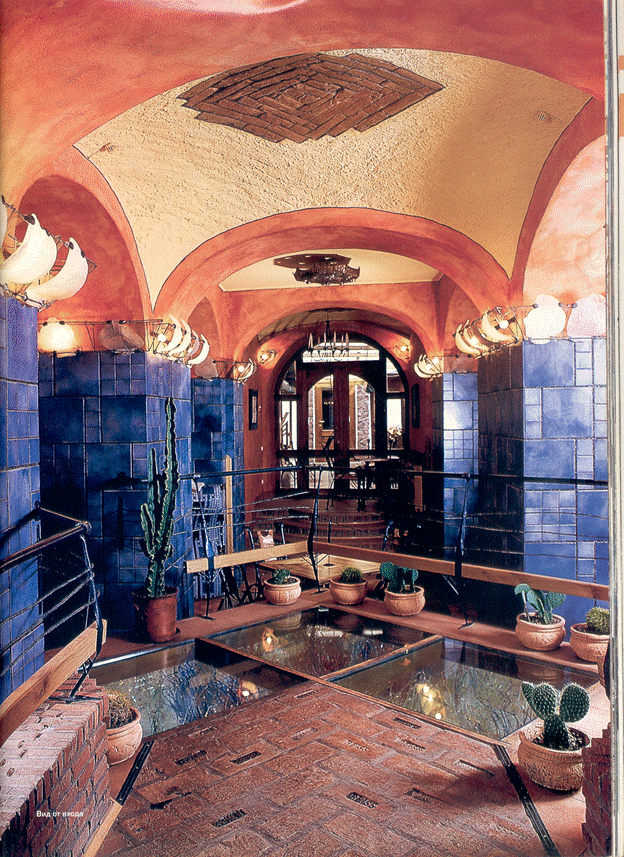 Иной подход в разработке проекта дизайна ресторана «Каутус» площадью 300 м2 (архитектор Павел Полецев, дизайнеры Василий Флуд и Сергей Лавренюк) применили во Львове. В построенном 200 лет назад здании новые хозяева решили после реконструкции организовать ресторан. Название «Кактус» родилось в связи с идеей разместить в интерьере коллекцию этих растений. Однако заказчики не захотели, чтобы декор был излишне привязан к названию. Поэтому под бронированным стеклом «посадили» волнистые стеклянные нити разных цветов, а небольшое количество кактусов оставили лишь на подиуме, подоконниках, столиках и на одной из стен. (рис. 15.22). Главное пожелание владельцев – создать интерьер «под старину неопределенного возраста». Во внутренней отделке максимально использованы естественная фактура, цвет и форма старинного кирпича.