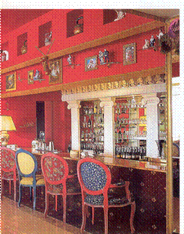 Потолок следующего зала украшен изображением целующихся Брежнева и Кастро. В углу расположтлся магазин «Китчевые штучки», предлагающий копии деревянных фигурок новых русских, украшающих один из залов, а также картин и коллажей, использованных в декоре всего кафе (рис. 15.27).