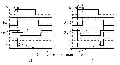 Различают статические и динамические риски. Статические риски – это кратковременное изменение сигнала, который должен был бы оставаться неизменным (единичным или нулевым). Если согласно логике работы КЦУ состояние выхода должно измениться, но вместо однократного перехода происходят многократные, то имеют место динамические риски. При динамических рисках первый и последний переходы всегда совпадают с алгоритмическими, предусмотренными логикой работы схемы. Статические риски такого свойства не имеют и считаются более опасными.
