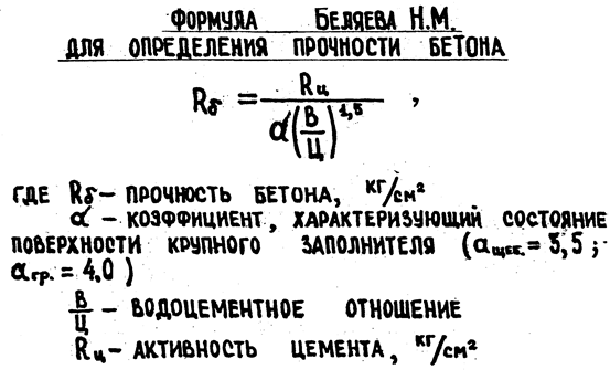 Рост производства портландцемента в середине XIX века создал условия для широкого применения бетона. Однако только на пороге XX столетия изготовление бетона перестало быть искусством, и были выявлены закономерности формирования бетонного камня. В1927 году проф. Н.М. Беляев предложил математическое выражение этой зависимости в виде формулы: