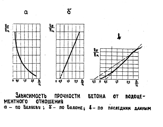 Что же касается обратной зависимости от В/Ц, то она объясняется так. Для получения удобоукладываемой смеси соотношение В/Ц принимают равным 0,5-0,7. Для химического взаимодействия требуется всего 15-20% воды от массы цемента. Избыточная вода испаряется из бетона, образуя в нем поры, что приводит к снижению плотности и прочности бетона. Исходя из этого, прочность бетона можно повысить путем уменьшения В/Ц и усиленного уплотнения. В настоящее время пользуются для расчетов более простой формулой, полученной в результате исследований швейцарского ученого Боломе и русского проф. Б.Г. Скрамтаева. Она имеет вид: