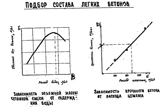 - снижение средней плотности легкого бетона можно добиться правильным подбором зернового состава пористого заполнителя, а также минимальным расходом выжущего (т.е. максимальным заполнением объема бетона пористым заполнителем, при этом для каждого вида заполнителя существует свой оптимальный зерновой состав, подбираемый опытным путем, а снижение расхода цемента возможно компенсировать применением высокоактивного вяжущего. = (4-6)