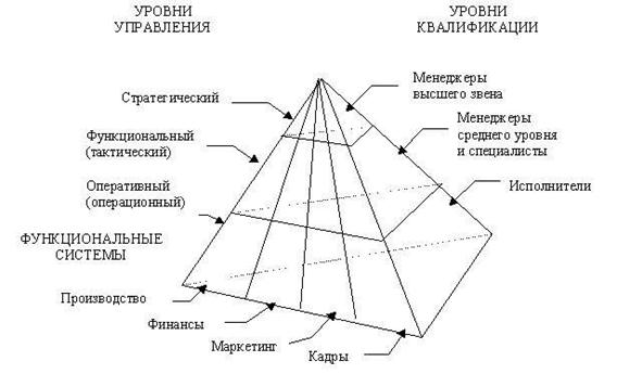 Рис. 2.3. Типы информационных систем в зависимости от функционального признака с учетом уровней управления и квалификации персонала