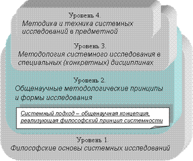 Главная цель методологии системных исследований (МСИ) это разработка единой концептуальной модели объекта исследования (ОИ). Следует создать абстрактный образ, который описывает ОИ в терминах теории систем (ТС). В современных системных исследованиях различают четыре уровня методологических знаний, которые явно или неявно присутствуют в процессе изучения системы.