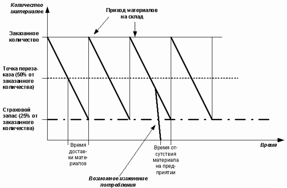 При этом, задача пополнения запасов решалась очень простым (с точки зрения трудозатрат персонала) и очень неэффективным (с точки зрения достижения основных целей предприятия) образом: при достижении нулевого запаса какого-либо материала формировался заказ на пополнение запаса поставщику или в производство. В этом случае, так как поставка не могла происходить моментально, в течение некоторого периода времени необходимый материал просто отсутствовал на складе.