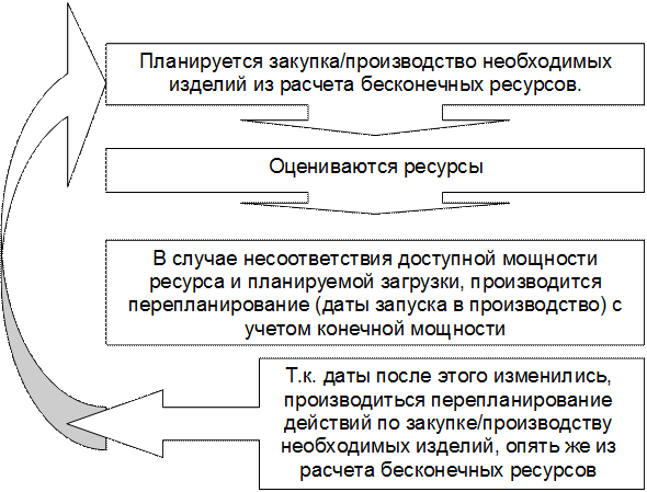 Этим обстоятельством можно пренебречь в случае серийного относительно стабильного производства. Однако при позаказном производстве, а так же в случаях существования жесткой конкуренции в сроках выполнения заказа и в точности соблюдения сроков алгоритм планирования MRP-II начинает давать неудовлетворительные результаты.