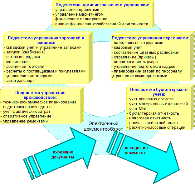 Подсистемы могут иметь модульную структуру, при этом набор модулей для разных предприятий может быть различным. Модули реализуют относительно законченные функции в составе подсистем.