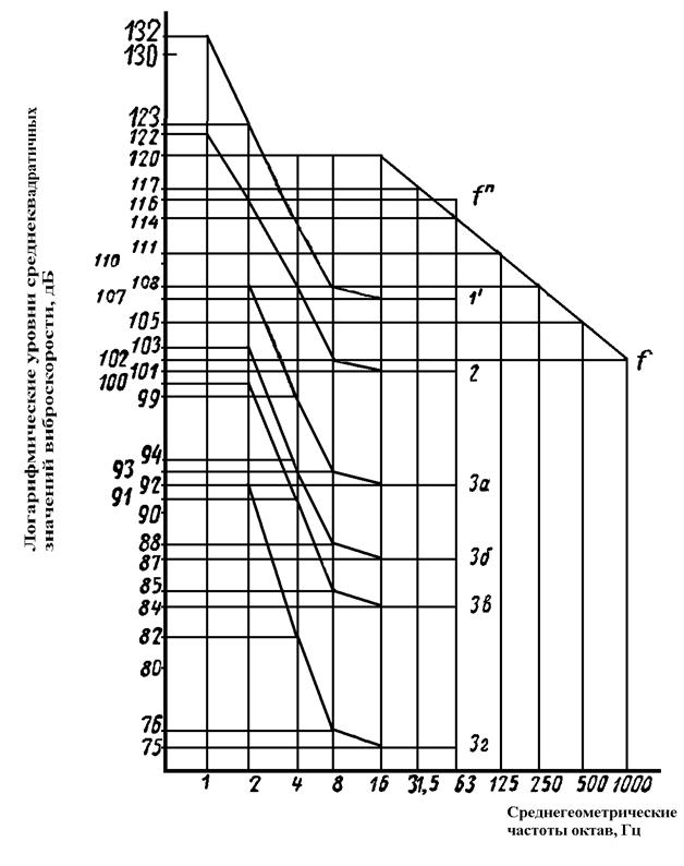 1-3 – общая вибрация: 1 – транспортная, 2 – транспортно-технологическая, 3 – технологическая (3а – в производственных помещениях, 3б – в служебных помещениях на судах, 3в – в производственных помещениях без вибрирующих машин, 3г – в помещениях административно-управленческих и для умственного труда), f – локальная вибрация.