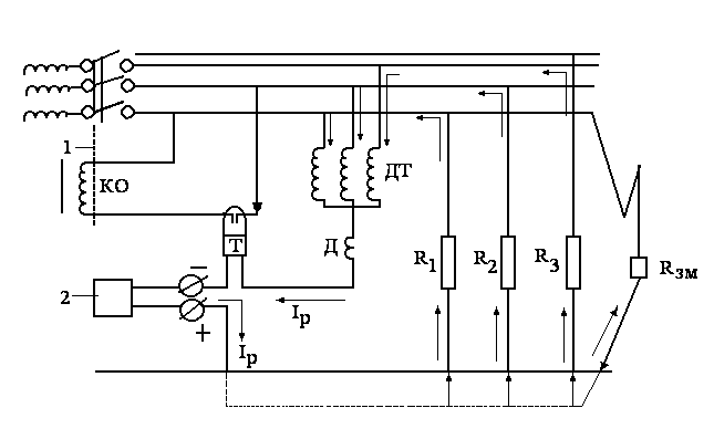 Датчиком служит реле тока Т с малым током срабатывания (несколько миллиампер). ДТ - предназначен для образования нулевой точки сети. Д – ограничивает утечку переменного тока в землю, которому он оказывает большое индуктивное сопротивление. Постоянный ток зависит от напряжения источника постоянного тока и общего сопротивления цепи: