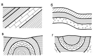 а – моноклиналь; б – флексура; в – антиклиналь; г - синклиналь